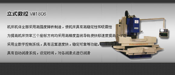 立式數(shù)控VM1806銑床是我公司根據(jù)制造業(yè)的市場(chǎng)需求,自行研制和開發(fā)的新型數(shù)控立式銑床,它采用模塊式設(shè)計(jì),除具備立式銑床的功能外可加側(cè)銑頭,實(shí)現(xiàn)臥式鏜銑功能,還可加裝刀庫使加工范圍和功能進(jìn)一步擴(kuò)大,適合于航空、航天工業(yè)復(fù)雜結(jié)構(gòu)件、試驗(yàn)件的型面加工,也適合汽車模具和零備件和制造。